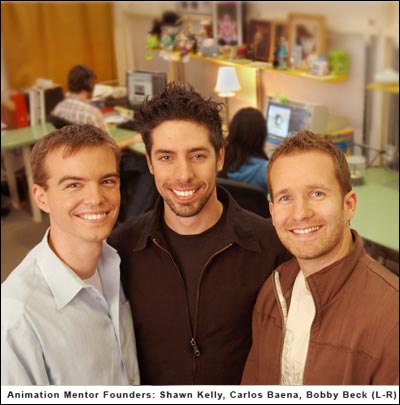 This really bummed me out because I wanted to see them succeed. I was driving home that very night after the first class with this thought in my head, “what is wrong here? How can these kids spend 4 years on their education and have nothing to show for it?” Something was wrong and it clicked in my head. The basic concept for Animation Mentor was born on my drive home that night; an online school, this would allow professional animators from around the world to teach people after work and from around the world. In the beginning it was going to have a lot to do with telephone conferencing which would have been pretty ugly. As the concept evolved I wrote a rough plan and pitched it to Shawn Kelly. He was instantly in as his passion is so contagious I knew that between the two of us we could probably make it happen, but we were missing one final ingredient, our other “brother,” Carlos Baena. The 3 of us together is what made this school happen. It was not easy to build, conceive and execute. Whenever someone was “down” the other two would pick you up and you would get the fire again and be totally motivated to make it happen.