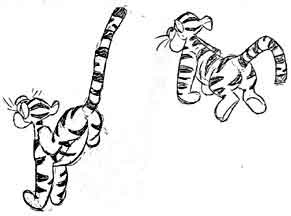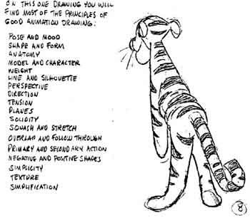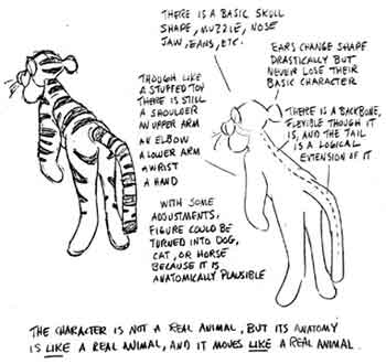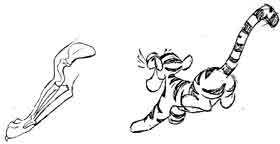 Aside from its purpose in the scene each drawing can be analyzed for different aspects of drawing. The whole body is a caracature of an animal, but all the parts of a real animal are present i.e., head, neck, back, hips, tail, etc. And each of them work and move in a plausible way.