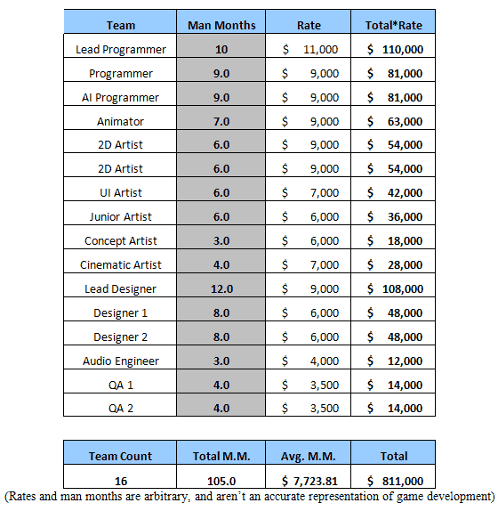 Excel is also a great tool for putting together development budgets, because of its ability to create formulas. With a few simple cell associations, a producer can create a template for determining how much a team will cost based on man months and monthly rate per team member. Below is a simple example of a projected budget for a 16-man team.